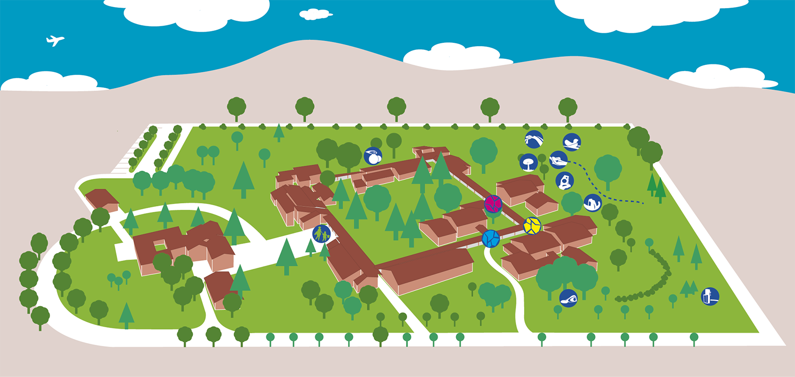 Chi ha pensato e immaginato, negli anni ’50, un Sante Zennaro diverso dal passato, lo ha fatto in grande: non solo un’ampia area verde appena fuori dalla città, una piccola città nella città, fornita di tutto, dalle aule alle case, alla mensa, all’ospedale, alla chiesa, ecc. Ha pensato anche a un ampio porticato che i bambini potessero percorrere protetti dalle intemperie, tanti viottoli tracciati con lastre attraverso il verde in modo che non si bagnassero le scarpe con la rugiada. E negli ampi spazi verdi non è mancata neppure l’arte, per i giochi e per la fantasia. Poi troviamo affisse alle pareti che appaiono sul grande piazzale centrale le ceramiche di Sergio Gioghi, artista che conduceva laboratori dentro la Palazzina 1 insieme a bambini e insegnanti, dove cuoceva le ceramiche che uscivano dalle mani dei bambini nel grande forno, purtroppo oggi distrutto in quanto molto ingombrante e pesante. Per arredare l’ampia area verde, alle spalle degli edifici dell'area est, sud e ovest, nel 1970 fu bandito un Concorso dalla Amministrazione Provinciale, dal quale uscirono vincitori gli scultori Alessandro Tagliolini, Nello Bini e il pittore Andrea Raccagni.