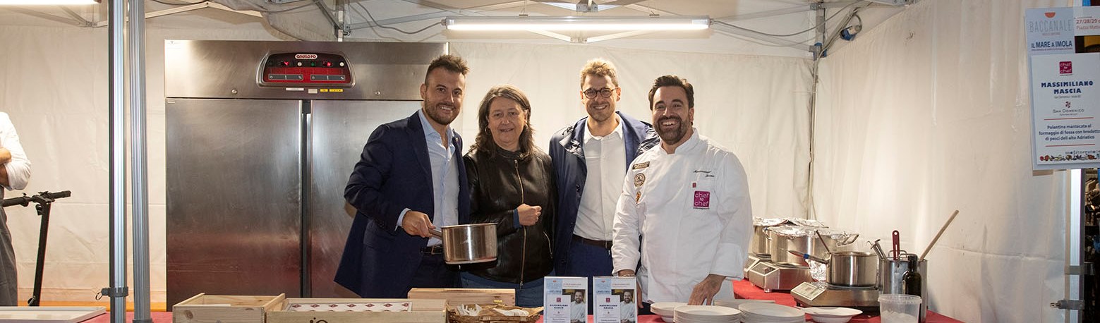 Il mare a Imola – Cominciata venerdì, continua fino a domenica 29 ottobre compresa, in piazza Matteotti, “Il mare a Imola”, l’iniziativa organizzata all’interno del Baccanale dall’Associazione culturale CheftoChef emiliaromagnacuochi. All’Isola del Gusto, allestita nel centro della piazza, alle ore 10 Alfredo Antonaros condurrà in un viaggio mediterraneo con pescatori, cuochi e narratori, attraverso la “Chiacchierata gastronomica: pesci e liliacee, atavici abbinamenti”, con Dario Picchiotti, chef ristorante Antica Trattoria di Sacerno. Alle ore 11 di scena il laboratorio “Conoscere il pesce “fin da piccoli”, il buono fa bene”, a cura dell’Associazione Arte.Na, con Marco Brancaleoni, medico nutraceutico. A seguire, alle ore 12 l’incontro “Facile da usare, buono da mangiare - “Pari dignità” tra i pesci dell’Alto Adriatico”, con Roberto Casali, Ecopesce, Cesenatico.