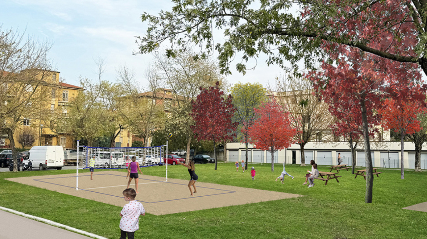 In prossimità del campo da basket esistente verrà potenziata l’area degli spettatori attraverso una serie di gradonate di arredo che garantiranno la sosta e una maggior possibilità di vivere tale spazio. Nella parte retrostante della gradonata verranno piantati nuovi alberi assicurando un’area ombreggiata fruibile. Il parco Montalcini verrà riqualificato tramite la realizzazione di un campo da beach volley e una palestra all’aperto, nuovi arredi per la sosta oltre alla messa a dimora di nuove alberature. Tutta l’area, già fortemente frequentata da sportivi nel campo esterno pubblico da basket e all'interno della palestra Volta, avrà due nuovi poli attrattivi che potenzieranno la funzione dello spazio pubblico e la possibilità di fare sport in modo accessibile a tutti.