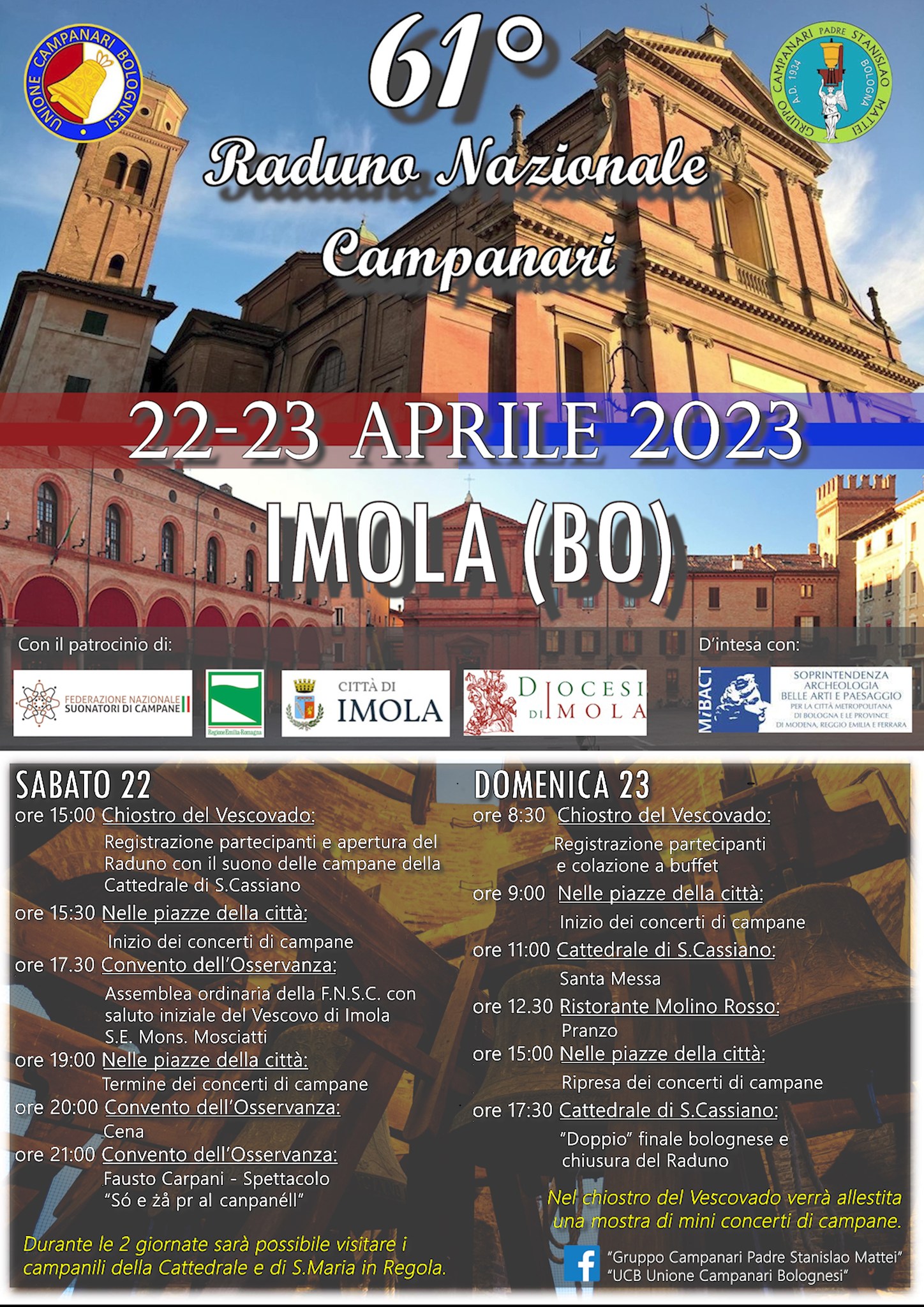 L’Unione Campanari Bolognesi e il Gruppo Campanari Padre Stanislao Mattei, le due associazioni di campanari di Bologna, organizzano infatti il 61esimo raduno nazionale campanari per il prossimo 22 e 23 aprile 2023 nel centro storico di Imola.