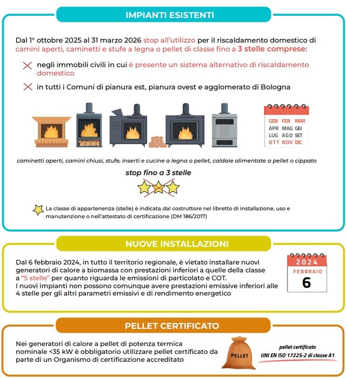 Dall'1 ottobre 2025 al 31 marzo 2026 nelle unità immobiliari comunque classificate (da E1 a E8) e in presenza di impianto di riscaldamento alternativo, è vietato utilizzare generatori di calore domestici alimentati a biomassa legnosa aventi prestazioni energetiche ed emissive che non sono in grado di rispettare i valori previsti almeno per la classe “4 stelle” e focolari aperti o che possono funzionare aperti.