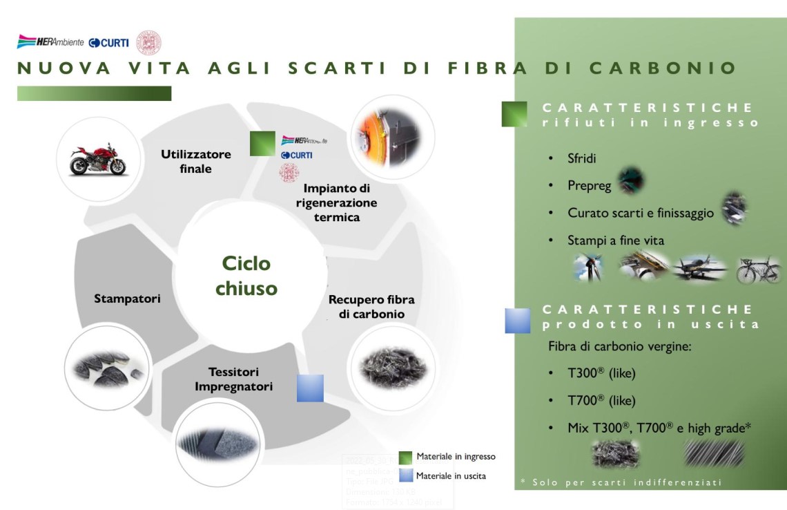 Ad oggi, gli scarti derivanti dalla lavorazione della fibra di carbonio sono destinati quasi esclusivamente allo smaltimento in discarica o al recupero energetico. La sfida lanciata con il progetto dell’impianto è di grande rilevanza e ha l’obiettivo di rigenerare la fibra di carbonio recuperata mantenendo inalterate le performance di leggerezza e resistenza della fibra vergine.