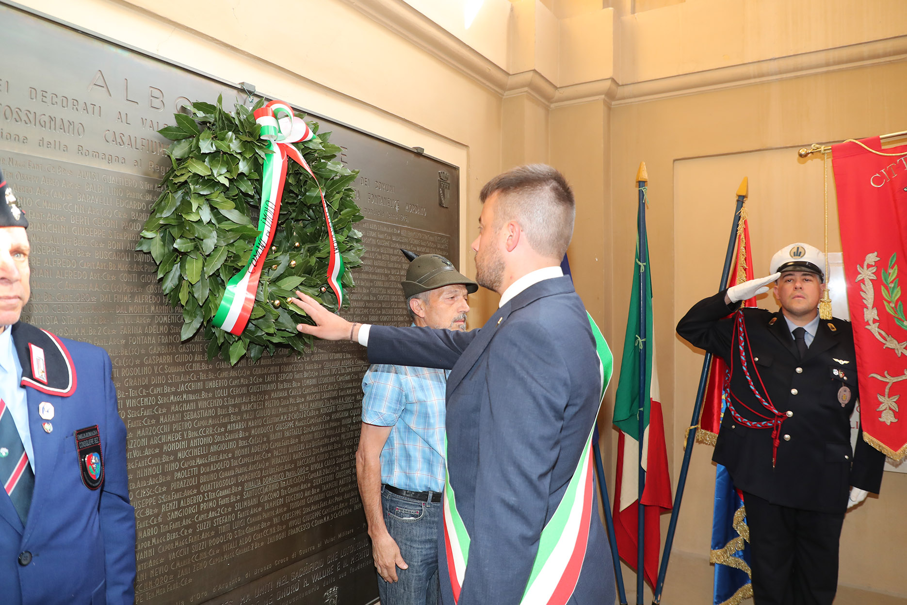 Si è svolta nel tardo pomeriggio la cerimonia organizzata dal Comune di Imola per celebrare il 2 giugno, Festa della Repubblica. In apertura di cerimonia, alla presenza delle autorità politiche, civili e militari, dei rappresentati delle forze dell’ordine e delle associazioni d’arma e partigiane, il sindaco Marco Panieri ha deposto una corona di alloro alla lapide che riporta l’Albo d’Onore dei decorati al valor militare e per merito di guerra dei Comuni di Imola, Borgo Tossignano, Casalfiumanese, Castel del Rio, Castel Guelfo, Dozza, Fontanelice, Mordano dall’annessione della Romagna al Regno d’Italia (1860) fino al termine della seconda guerra mondiale (1945). La lapide è posta a metà dello scalone nobile del palazzo Comunale.