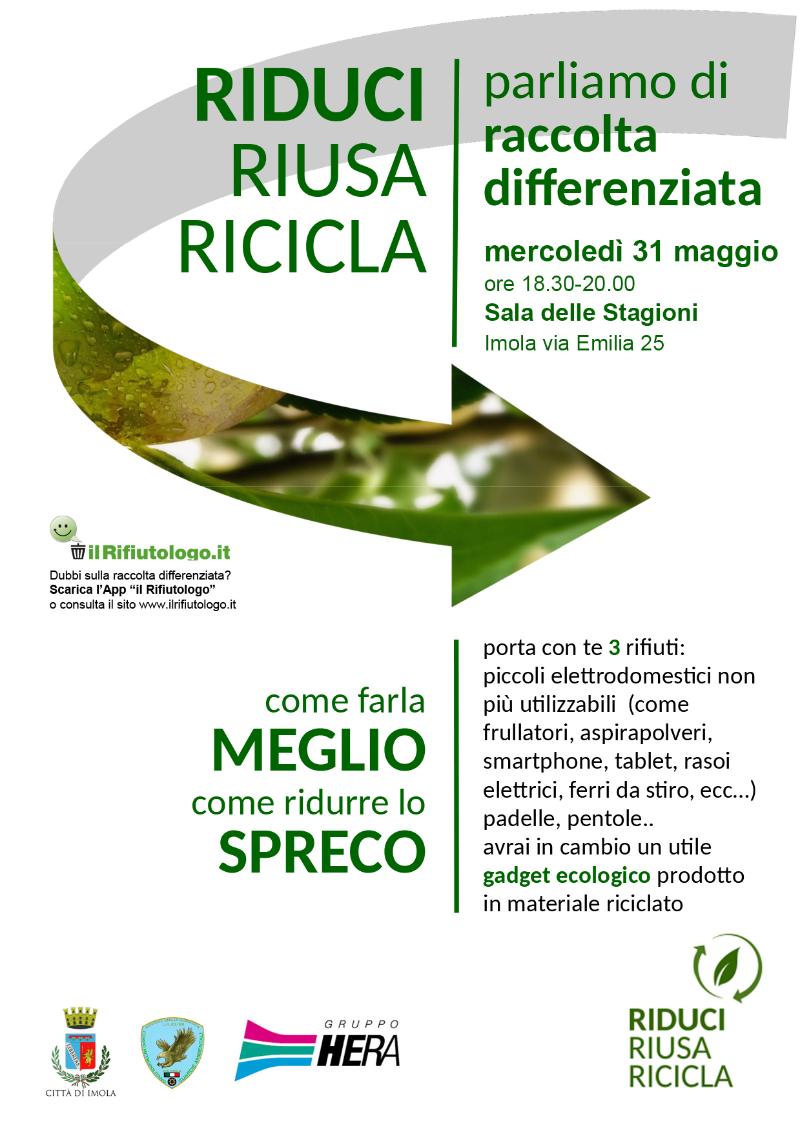 Mercoledì 31 maggio, alle 18.30, nella Sala delle Stagioni (via Emilia, 25) si svolgerà, infatti, un nuovo appuntamento del ciclo di incontri “Riduci, riusa, ricicla” promosso dal Comune di Imola, in collaborazione con Hera e delle CGam, con l’obiettivo di promuovere la cultura della riduzione dei rifiuti, del riuso e del riciclo a partire dalle abitudini quotidiane e dai servizi a disposizione nella città per fare la raccolta differenziata. La finalità è duplice: proseguire un’attività di informazione e sensibilizzazione che per essere efficace deve essere costante e contribuire al contrasto dell’abbandono dei rifiuti.