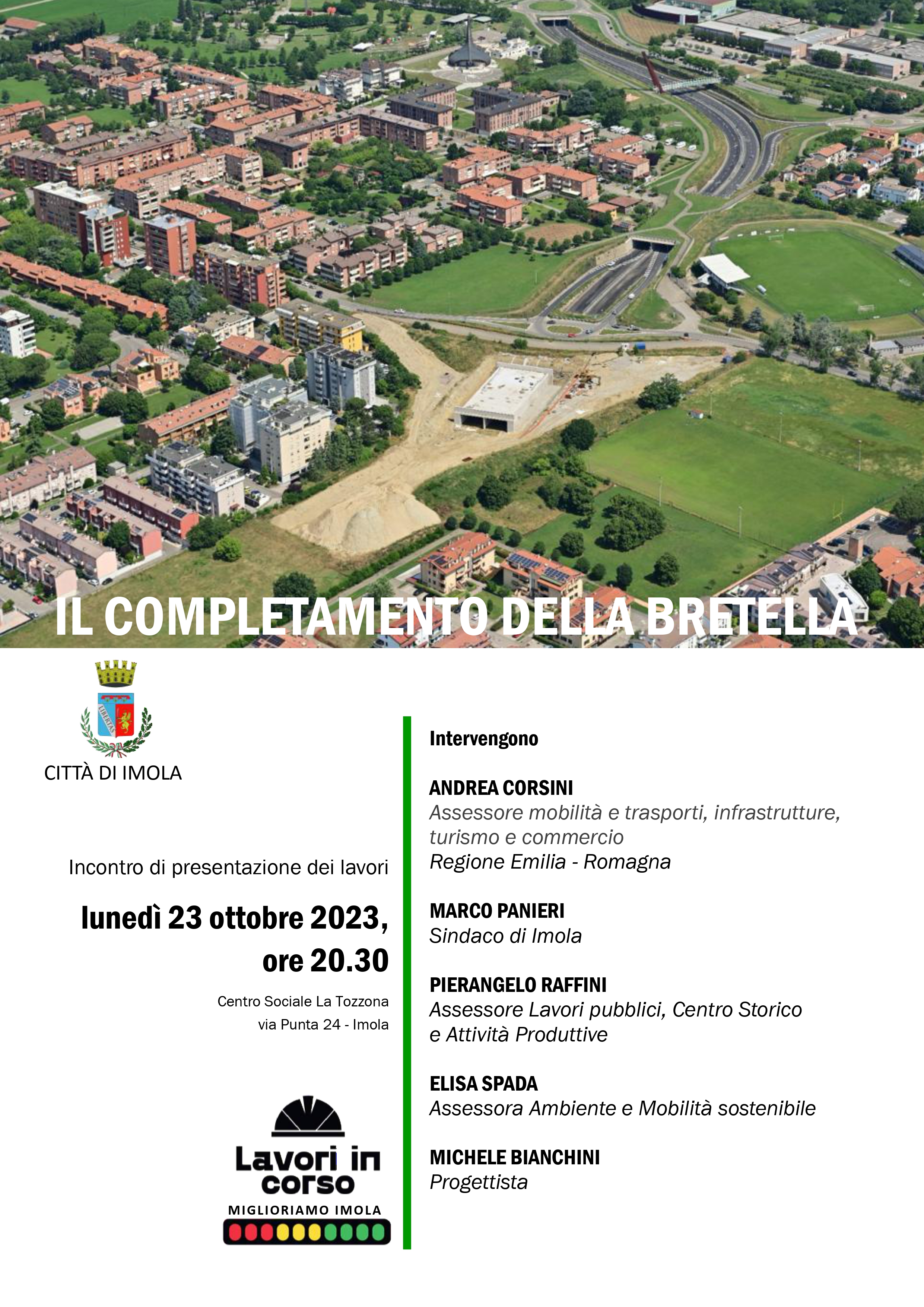 Lunedì 23 ottobre, alle ore 20,30, al centro sociale La Tozzona (via Punta 24), il Comune organizza un incontro pubblico di presentazione dei lavori, dal titolo “Il completamento della Bretella”.