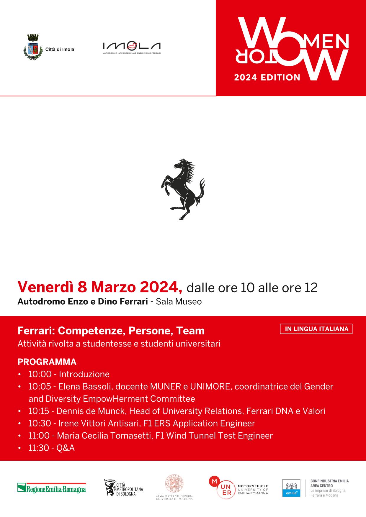 Programma: 10:00 – Introduzione; 10:05 - Elena Bassoli, docente MUNER e UNIMORE, coordinatrice del Gender and Diversity EmpowHerment Committee; 10:15 - Dennis de Munck, Head of University Relations, Ferrari DNA e Valori; 10:30 - Irene Vittori Antisari, F1 ERS Application Engineer; 11:00 - Maria Cecilia Tomasetti, F1 Wind Tunnel Test Engineer; 11:30 - Q&A