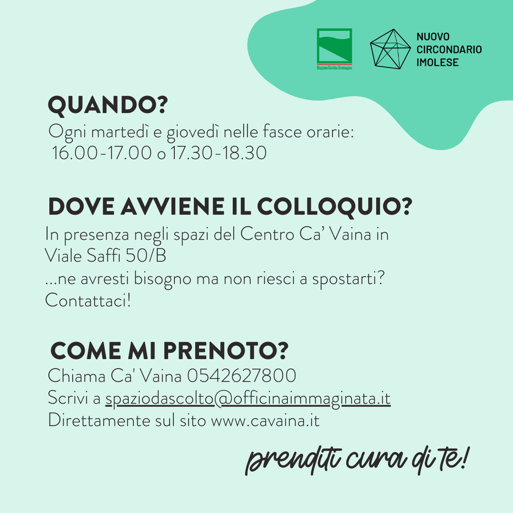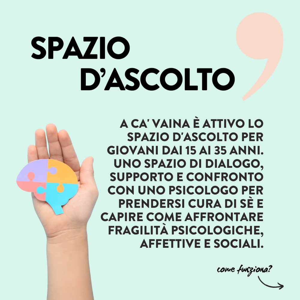 Al Centro giovanile Ca' Vaina (viale Saffi 50-b - Imola) è attivo uno "spazio di ascolto" rivolto ai giovani dai 15 ai 35 anni residenti nei Comuni del Circondario imolese. Il servizio è stato avviato nell'anno 2022 su iniziativa del Nuovo Circondario Imolese e dei suoi 10 Comuni, in coerenza con i bisogni specifici emersi dalla popolazione giovanile. E' finanziato con fondi provenienti dalla Regione Emilia-Romagna nell'ambito dei progetti di promozione della partecipazione attiva, dello sviluppo individuale e del benessere dei giovani.