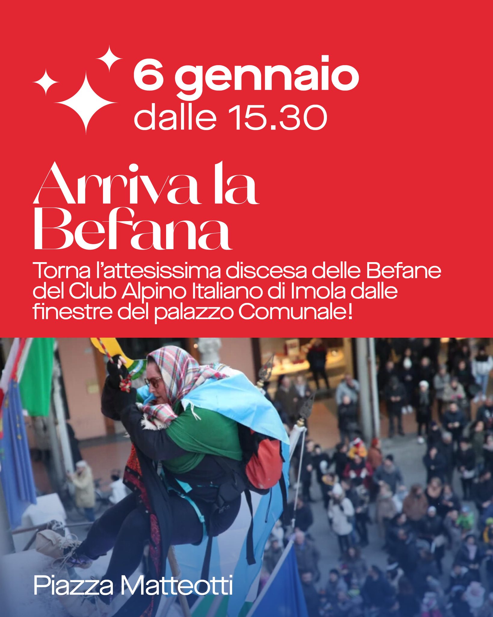Protagoniste dell’evento saranno le Befane del Club Alpino Italiano Sezione di Imola, che si caleranno dalle finestre del Palazzo Comunale offrendo uno spettacolo suggestivo e molto amato da bambini e famiglie. Un momento ormai tradizionale che ogni anno richiama numerosi cittadini nel cuore del centro storico.