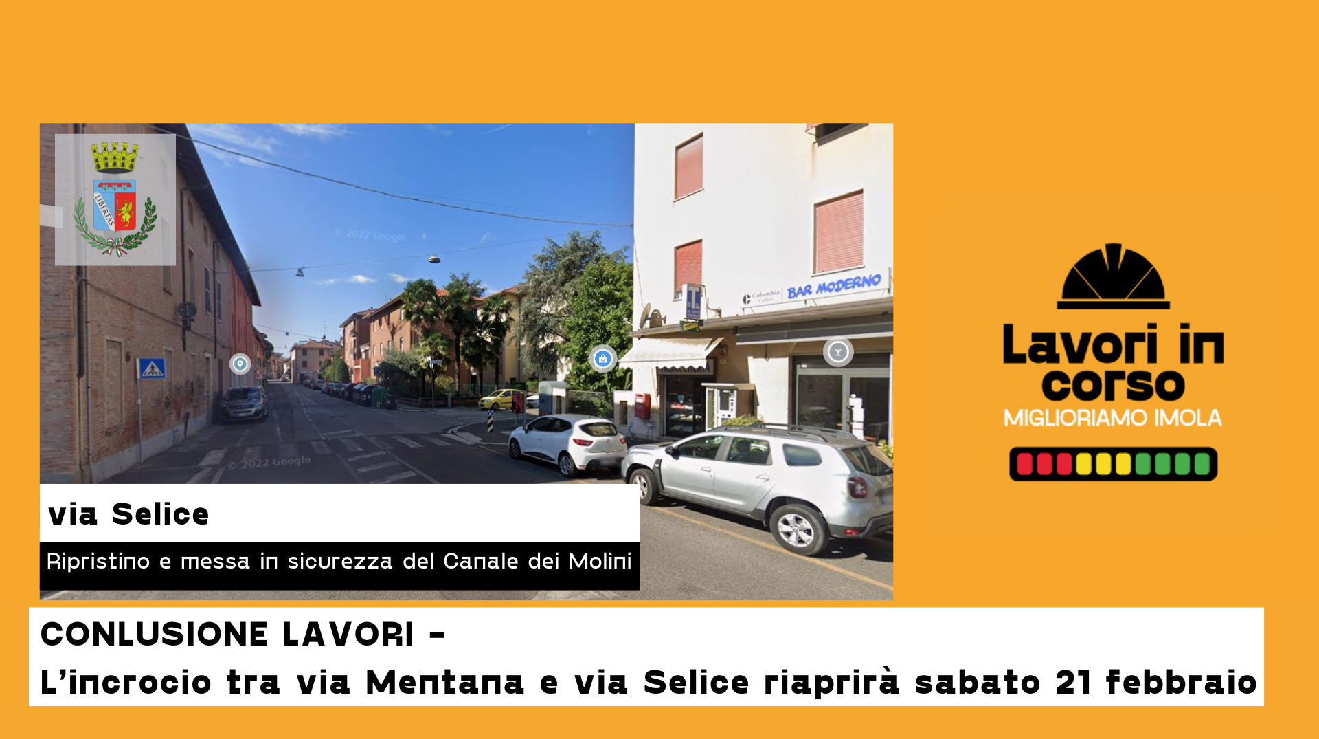 L’incrocio tra via Mentana e via Selice, interessato dal cantiere della copertura del Canale dei Molini, riaprirà sabato 21 febbraio 2026. L’asfaltatura è prevista per venerdì 20 febbraio 2026, mentre il completamento con la segnaletica orizzontale è programmato per lunedì 23 febbraio. La Direzione lavori sarà presente sul cantiere prima della riapertura al traffico per verificare che tutto sia regolarmente eseguito.