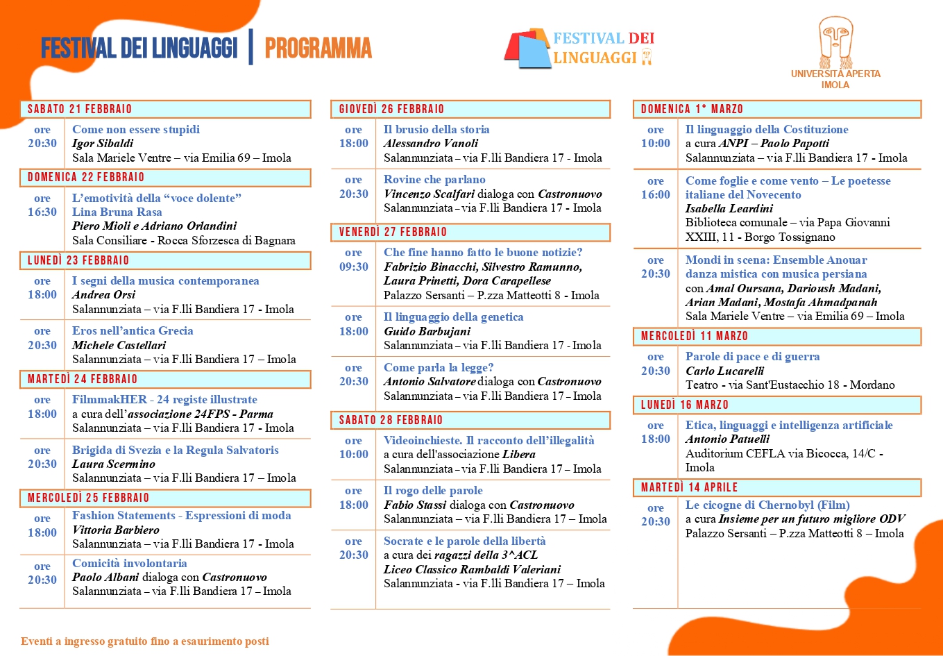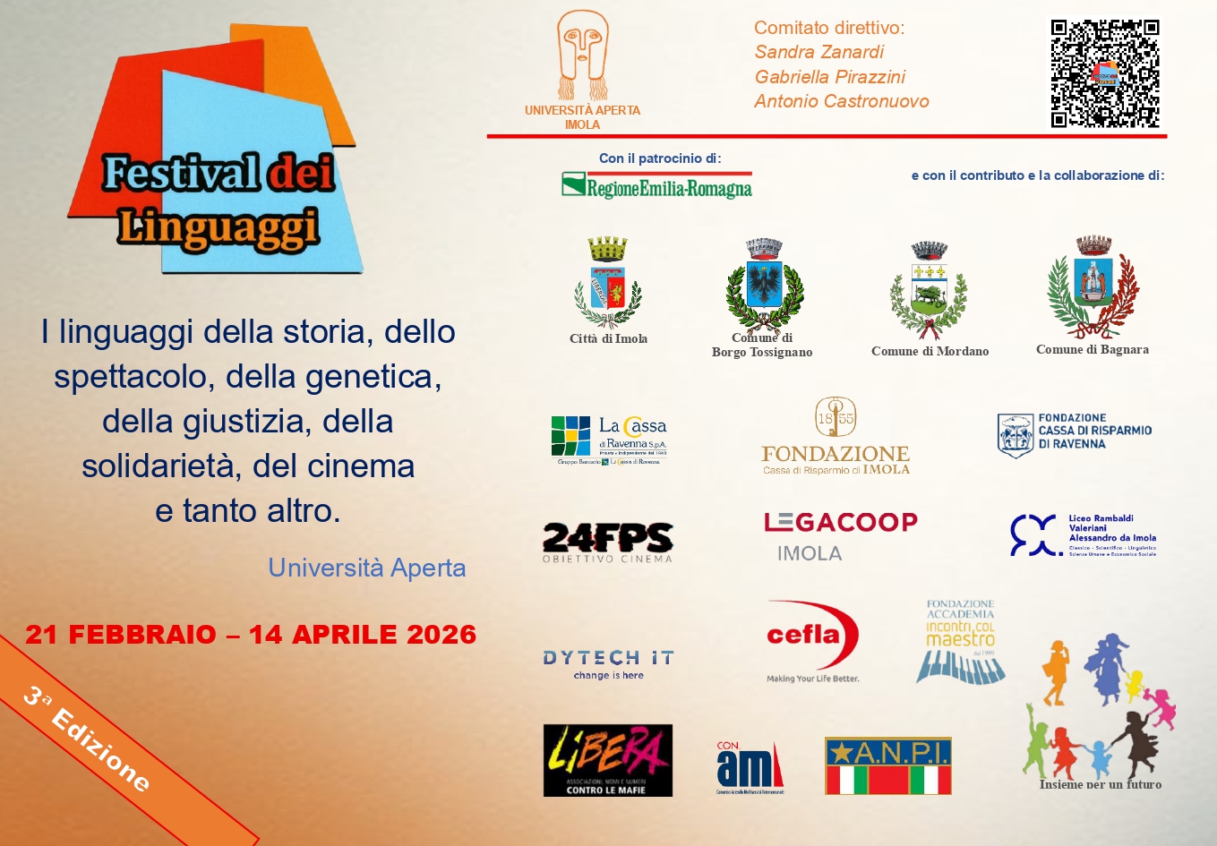 Si parla, si scopre, si ride, si fa musica e si balla: la terza edizione del Festival dei Linguaggi propone un programma ricco e coinvolgente, aperto a tutte le forme di espressione artistica, creativa, storica e scientifica. Anche quest’anno il comitato direttivo di Università Aperta ha scelto di coinvolgere importanti voci del panorama nazionale e il mondo delle associazioni, ampliando sia il calendario sia il numero degli eventi. Il festival si svolgerà dal 21 febbraio al 1° marzo per un totale di 22 incontri. Alcuni appuntamenti di approfondimento proseguiranno fino ad aprile con un post-festival. Oltre a Imola, il Festival toccherà anche Bagnara, Borgo Tossignano e Mordano.