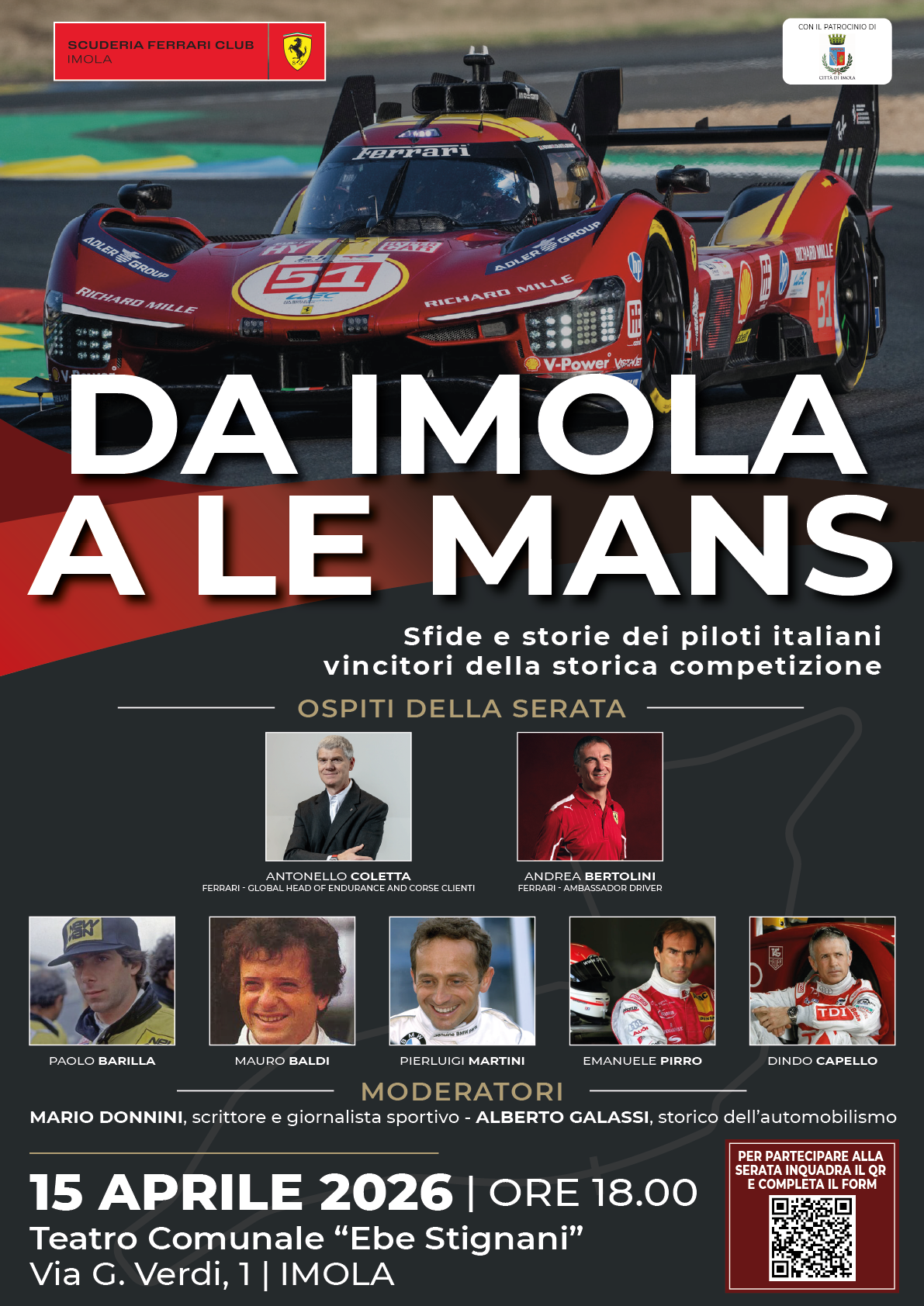 Si intitola Da Imola a Le Mans l’evento che mercoledì 15 aprile alle 18 riunirà sul palco del Teatro Comunale “Ebe Stignani” i piloti italiani vincitori della prestigiosa 24 Ore di Le Mans tra il 1985 e il 2008.