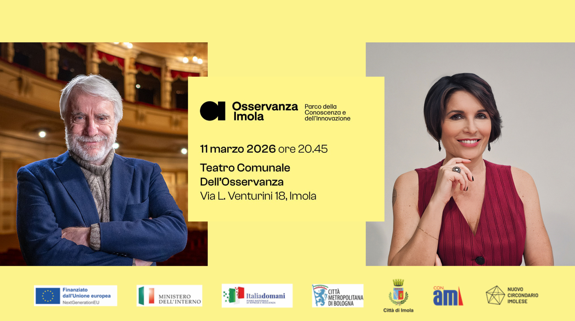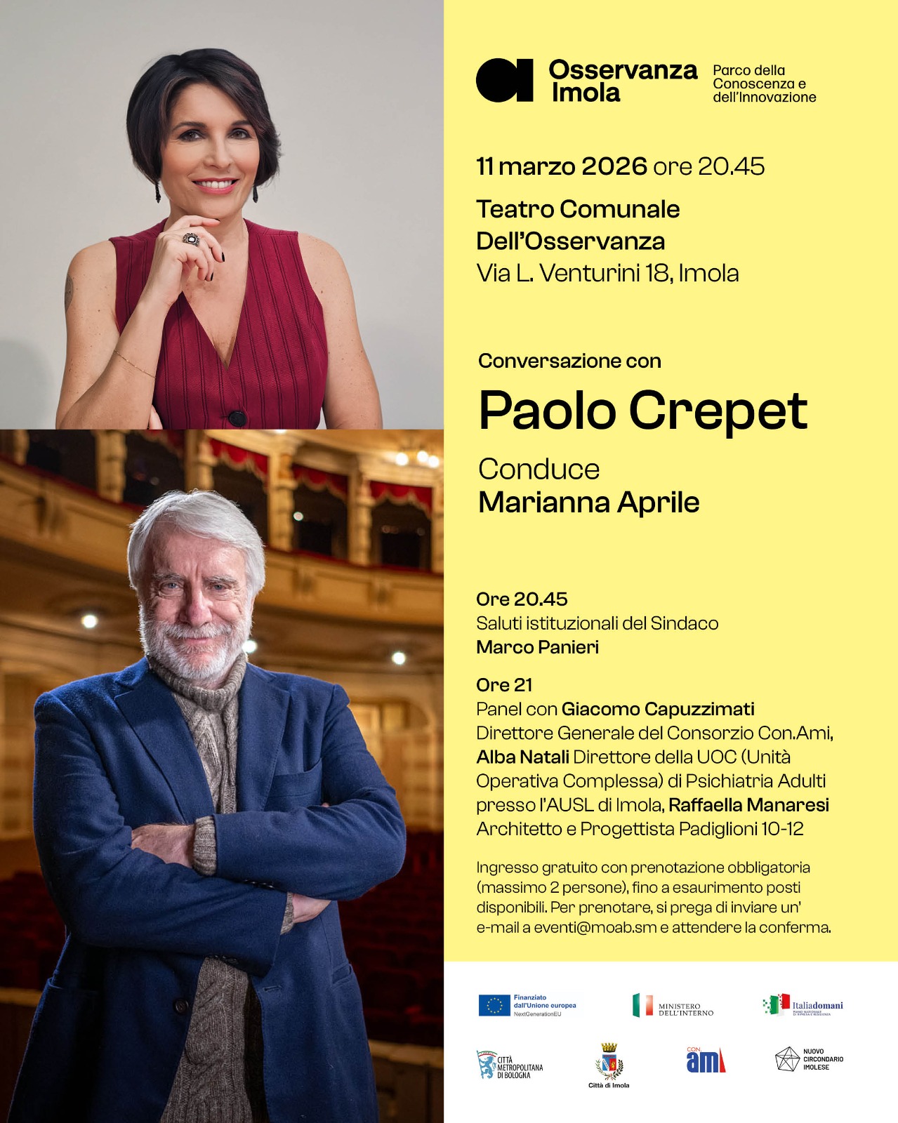 A dialogare con l’ospite sarà la giornalista Marianna Aprile, in una serata che si aprirà alle 20,45 con i saluti istituzionali del sindaco Marco Panieri. Alle 21 seguirà un panel di approfondimento con Giacomo Capuzzimati, Direttore Generale del Consorzio Con.Ami; Alba Natali, Direttore della UOC (Unità Operativa Complessa) di Psichiatria Adulti presso l’AUSL di Imola; Raffaella Manaresi, architetto e progettista dei Padiglioni 10-12.