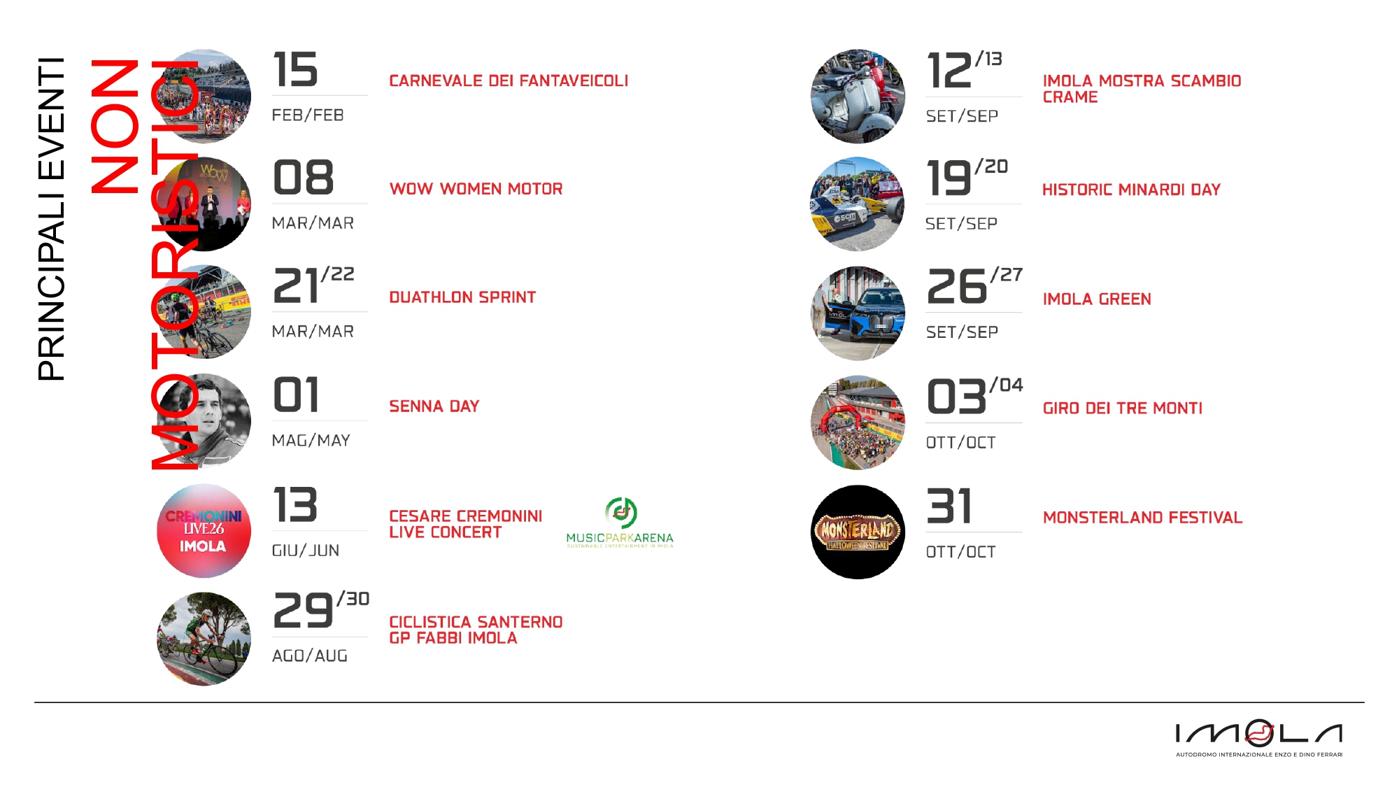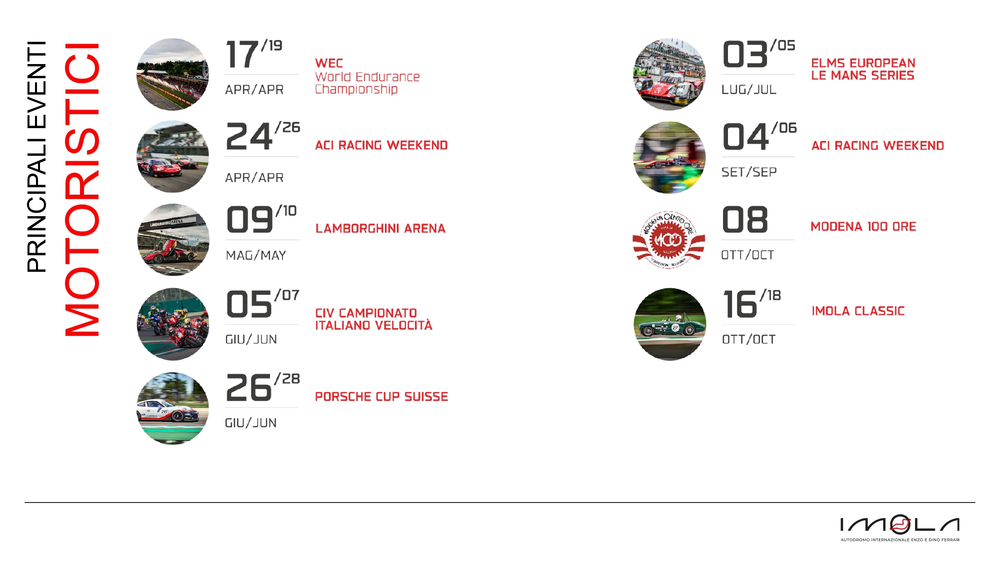 Il calendario darà ampio spazio anche al motorsport nazionale con gli appuntamenti dell’ACI Racing Weekend, che porteranno a Imola i principali campionati tricolori auto, e con il Campionato Italiano Velocità, riferimento assoluto per il motociclismo nazionale su pista.