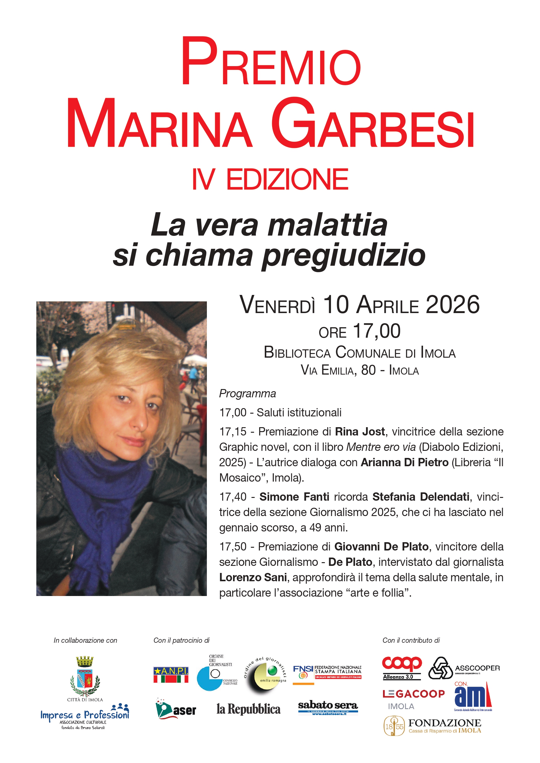 La cerimonia di consegna - La consegna dei riconoscimenti avverrà il prossimo venerdì 10 aprile, alle ore 17 a Imola, nella BIM – biblioteca comunale, in via Emilia 80. Dopo i saluti istituzionali da parte dell’Amministrazione comunale e degli organizzatori, si procederà alla premiazione dei vincitori. Verrà presentato il libro di Rina Jost Mentre ero via (Diabolo Edizioni, 2025), alla presenza dell’autrice; a seguire Giovanni De Plato, intervistato dal giornalista Lorenzo Sani, approfondirà il tema della salute mentale, in particolare l'associazione “arte e follia”.