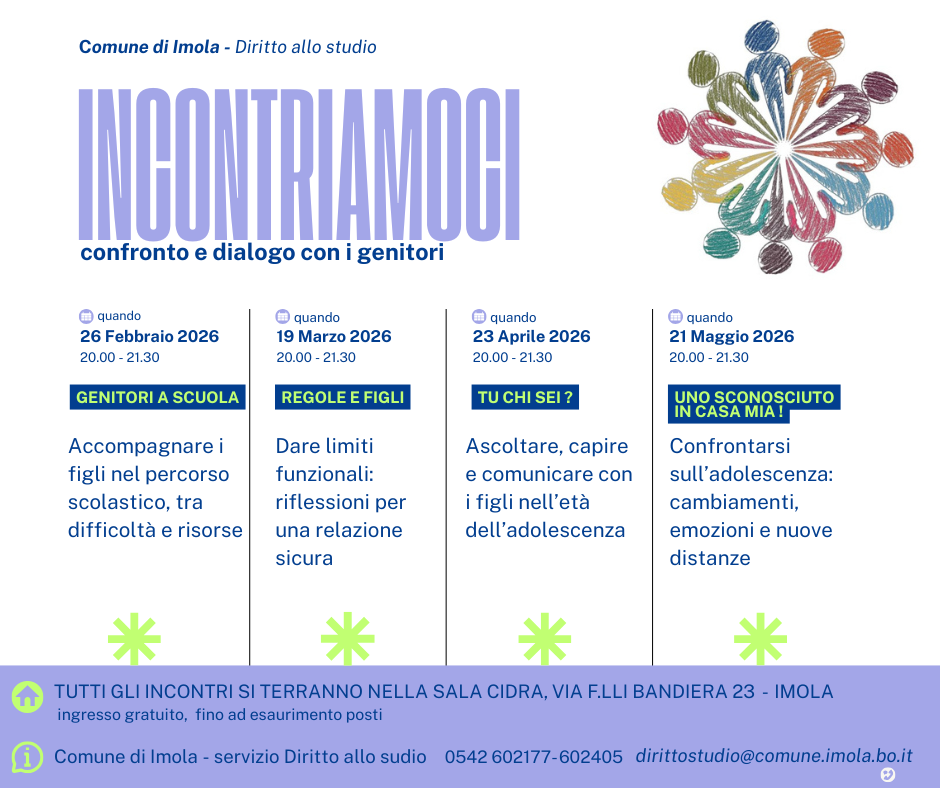 Il Servizio Diritto allo Studio propone per l’anno scolastico 2025/2026 un ciclo di 4 incontri su tematiche significative per le famiglie del territorio, in continuità di quanto realizzato nell’anno scolastico concluso.