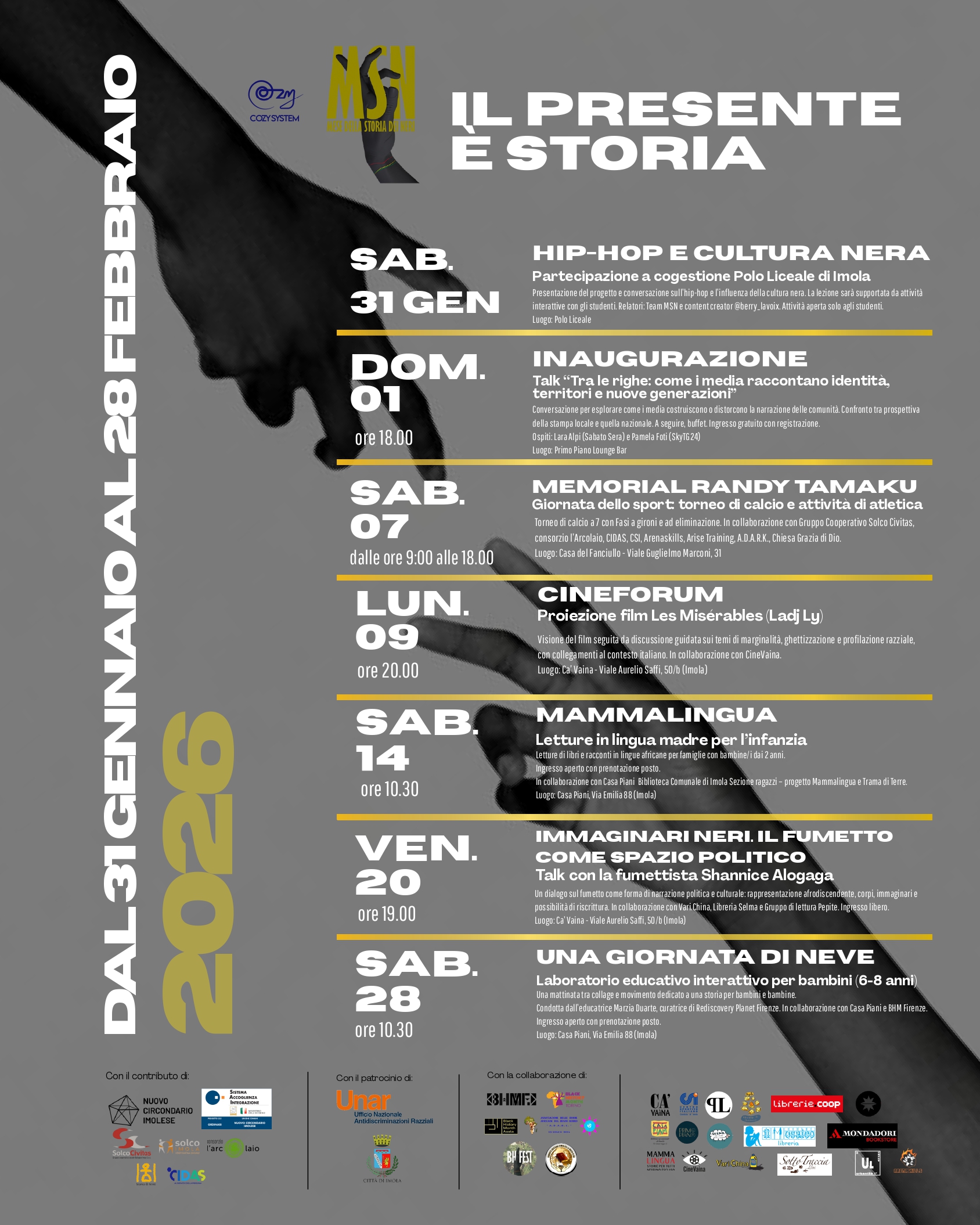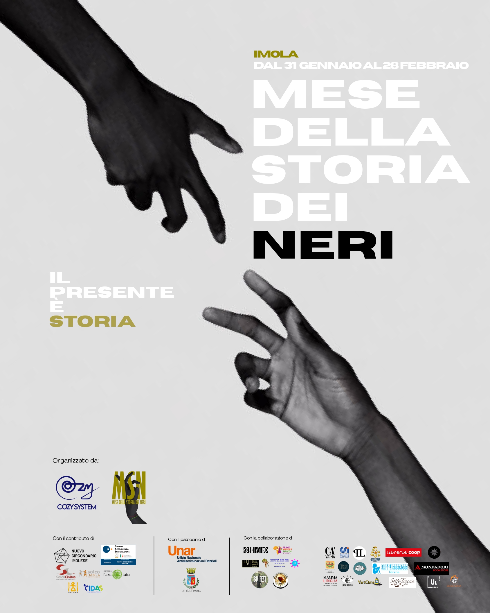 Il Mese della Storia dei Neri si realizza quest’anno grazie al sostegno del Nuovo Circondario Imolese attraverso il Progetto SAI – Sistema di Accoglienza e Integrazione. All’interno di questo percorso, le cooperative gruppo cooperativo Solco Civitas, CIDAS, Consorzio L’Arcolaio e Trama di Terre hanno scelto di contribuire attivamente alla realizzazione del progetto, favorendo anche la partecipazione diretta delle persone accolte nei rispettivi centri alle attività in programma.